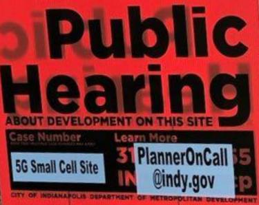 The public notice will have information about the hearing, the applicants contact information, and a Current Planning Staff Planner contact on the back side. The orange sign is only a notice for a hearing, no decision has been made at this time. There will be a public hearing as indicated in the mailed public notice, where you will have an opportunity to voice your opinion in support or opposition of the petition request. Or, you may submit a written statement by email to DMDpubliccomments@indy.gov, which should include the approximate address of the sign location. All written comments submitted 24 hours prior to a hearing is guaranteed in the record for review. If you do not know the case number or the Planner assigned to the case, please email planneroncall@indy.gov with the address of the proposed 5G pole.